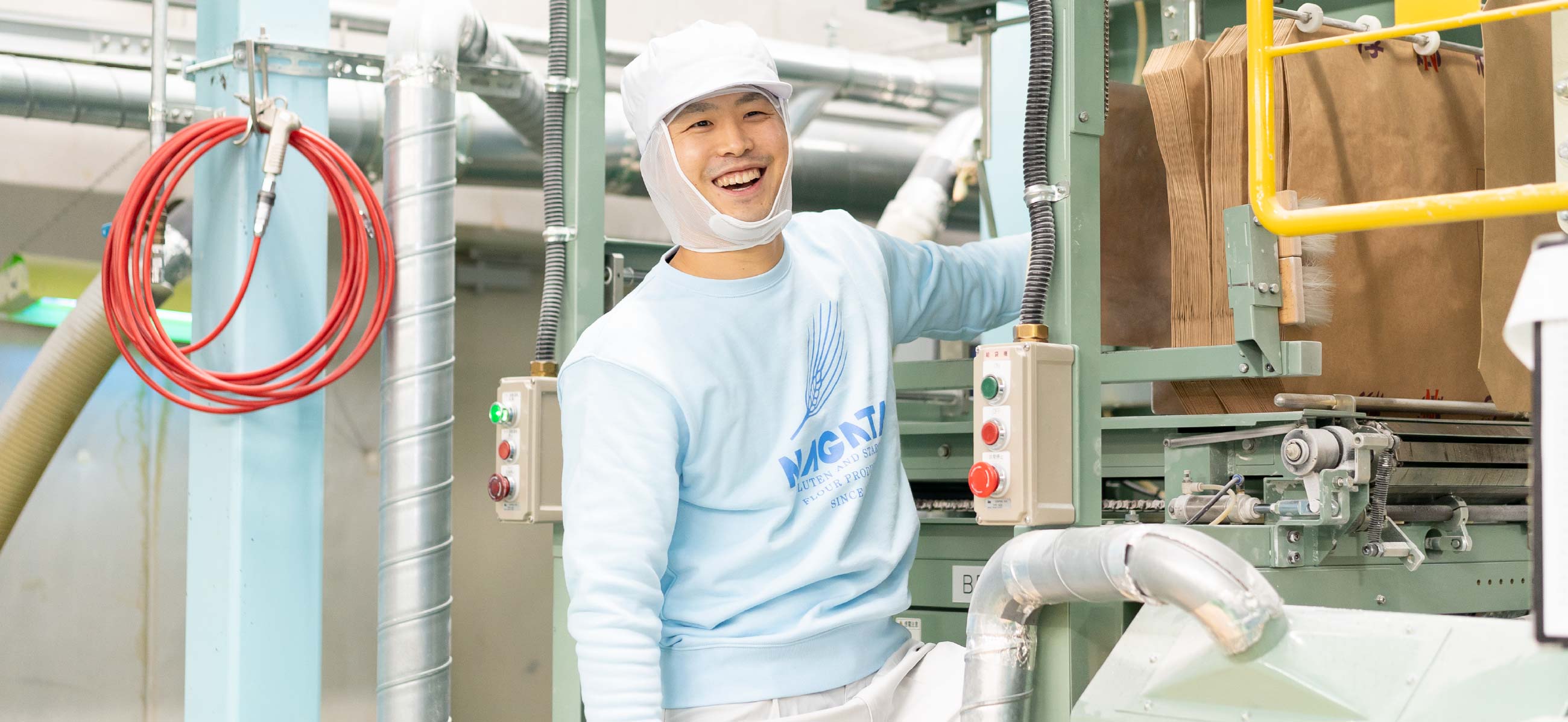 でん粉・たん白の原料となるでん粉乳液の脱水を行い、熱風乾燥後の製品の袋詰めまでの作業を一貫して担当しています。配属された当初は製品や業務について何も知識がなく、苦労したこともありましたが、社内研修や先輩方にサポートいただきながら経験を重ねてノウハウを培ってきました。とはいえ、まだまだ覚えることも多く、日々勉強中です。